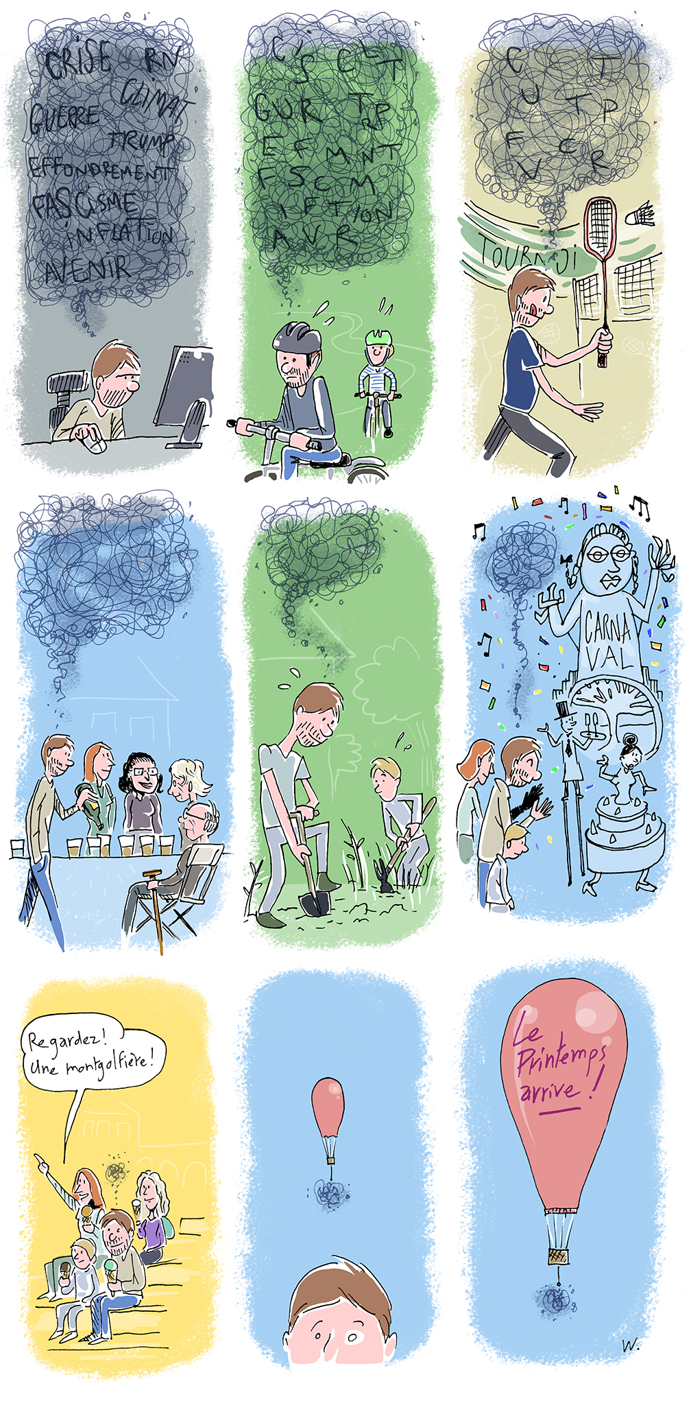 #idéesnoires #Printemps #PenserPrintemps #LePrintempsarrive #vélo #sport #jardinage #apéro #famille #carnaval #montgolfière #envol